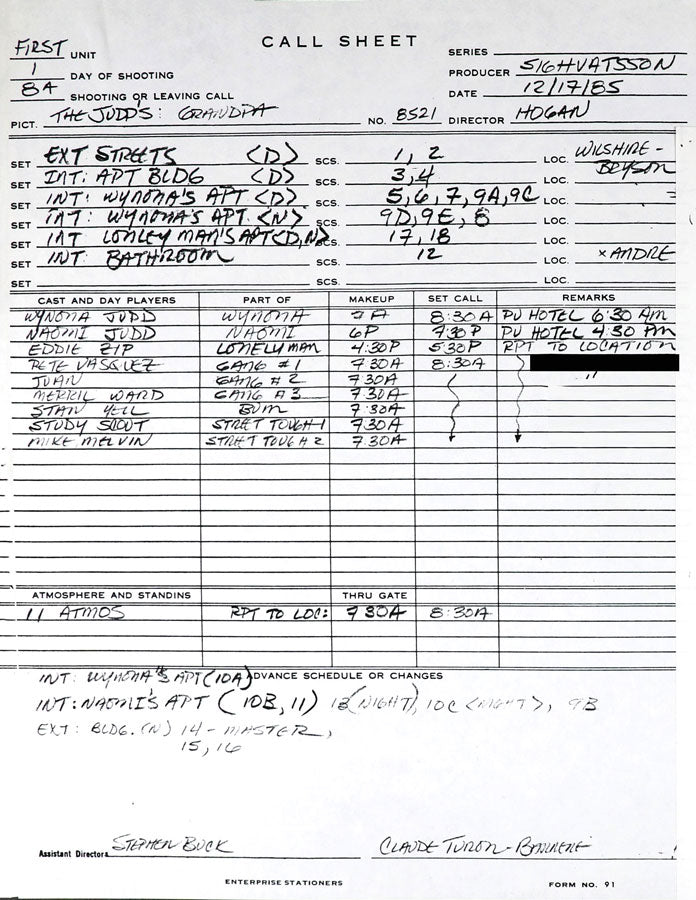 Shooting script, call sheet, and location map for the "Grandpa (Tell Me 'Bout the Good Old Days)" music video.