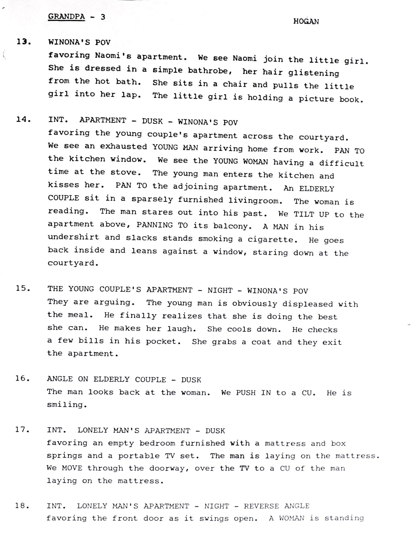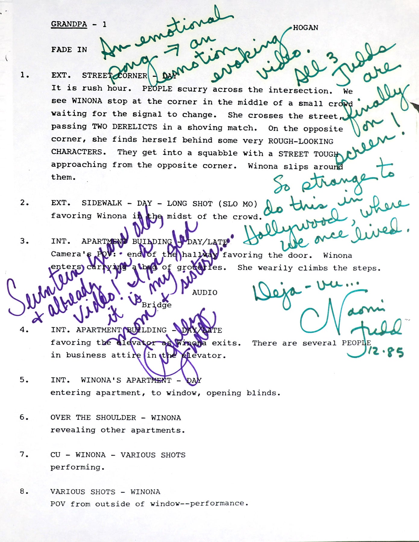 One page of the script contains handwritten notes from Naomi and Ashley Judd, commemorating the event and noting the emotional importance of the song "Grandpa." (Ashley plays the young woman arguing with a man over the dinner table.)