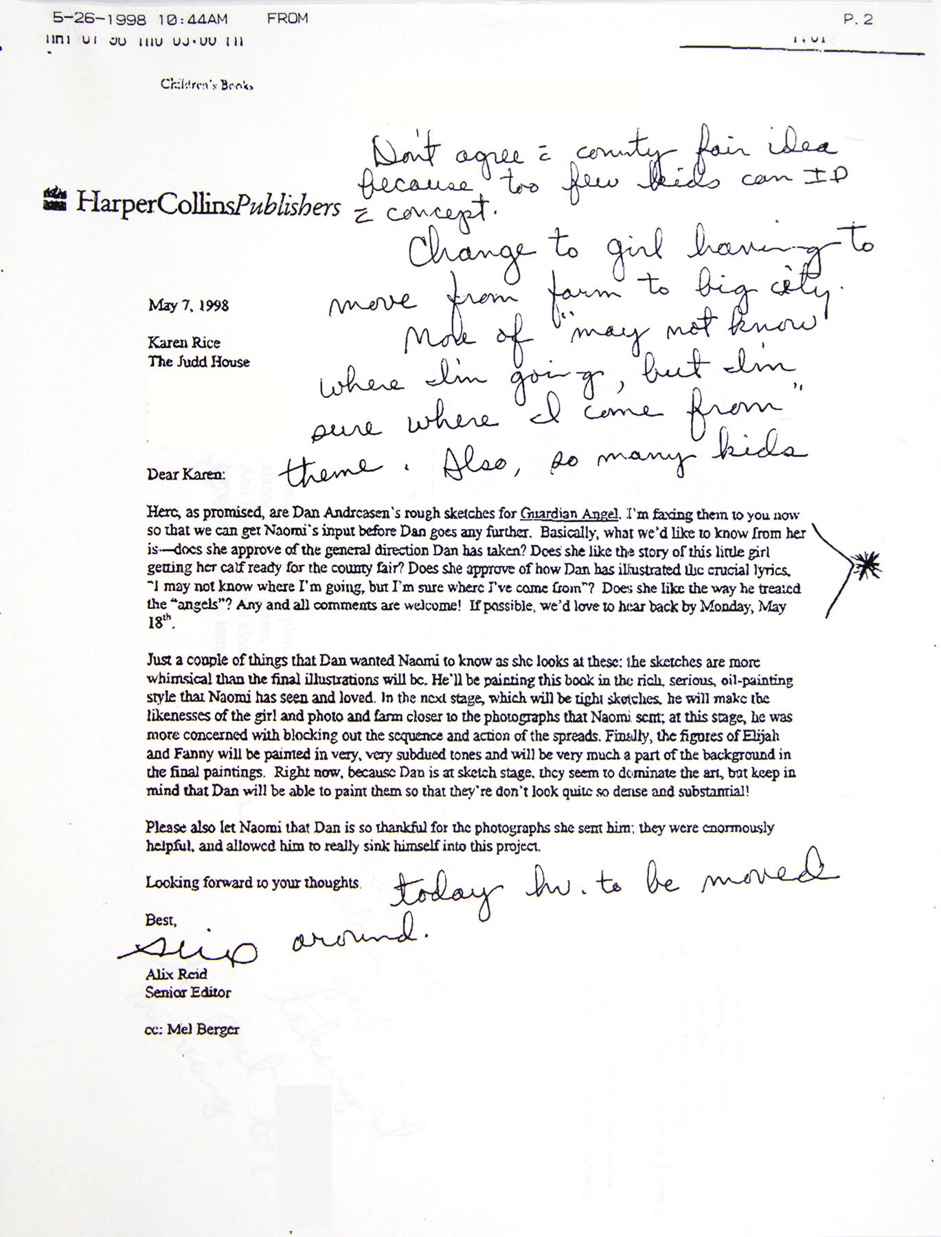 This faxed correspondence from HarperCollins exemplifies Naomi’s hands-on involvement in shaping Guardian Angels, her children’s book.