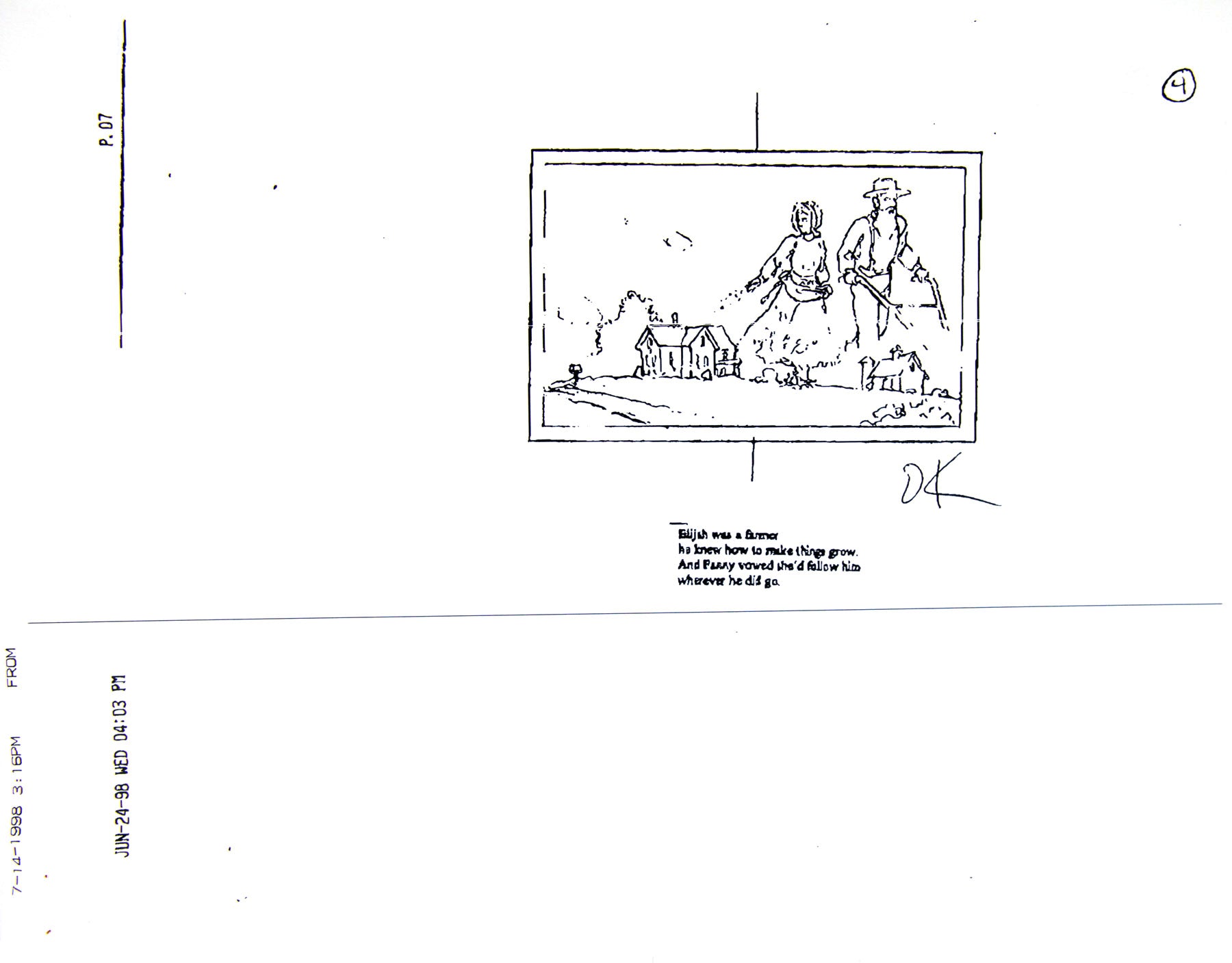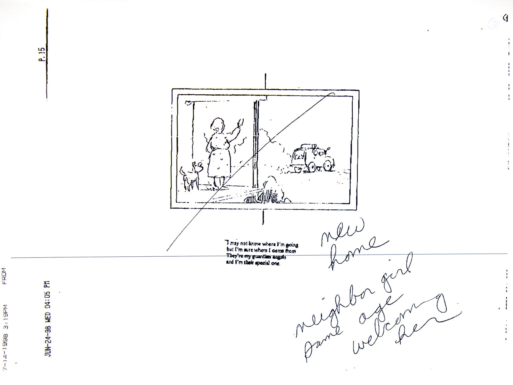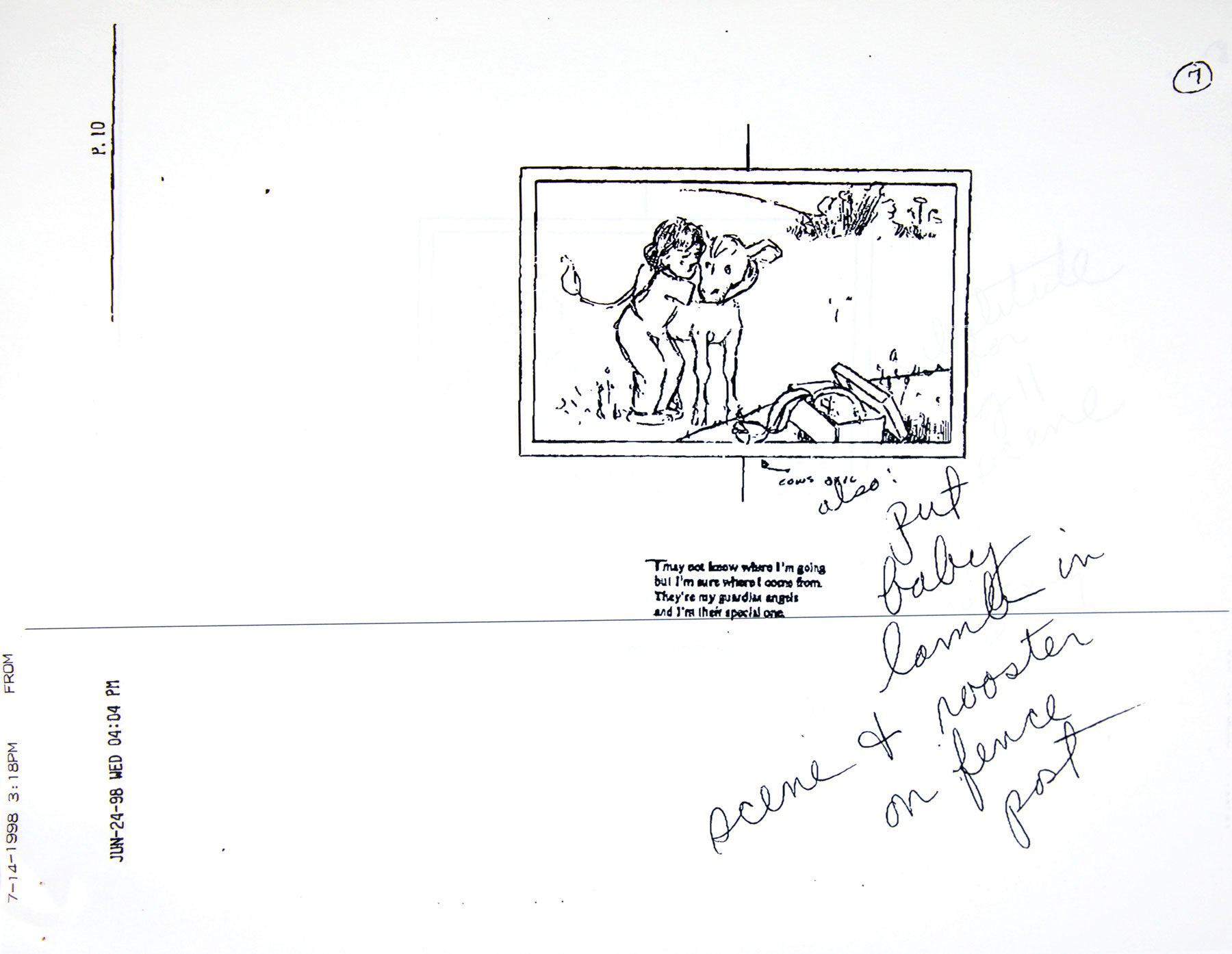 The original concept, illustrated by Dan Andreasen, depicted a little girl preparing to show a calf at the County Fair. However, Naomi redirected the story’s focus toward a young girl moving from the family farm to a big city, a shift she felt better reflected the theme: “I may not know where I’m going, but I’m sure where I came from.”