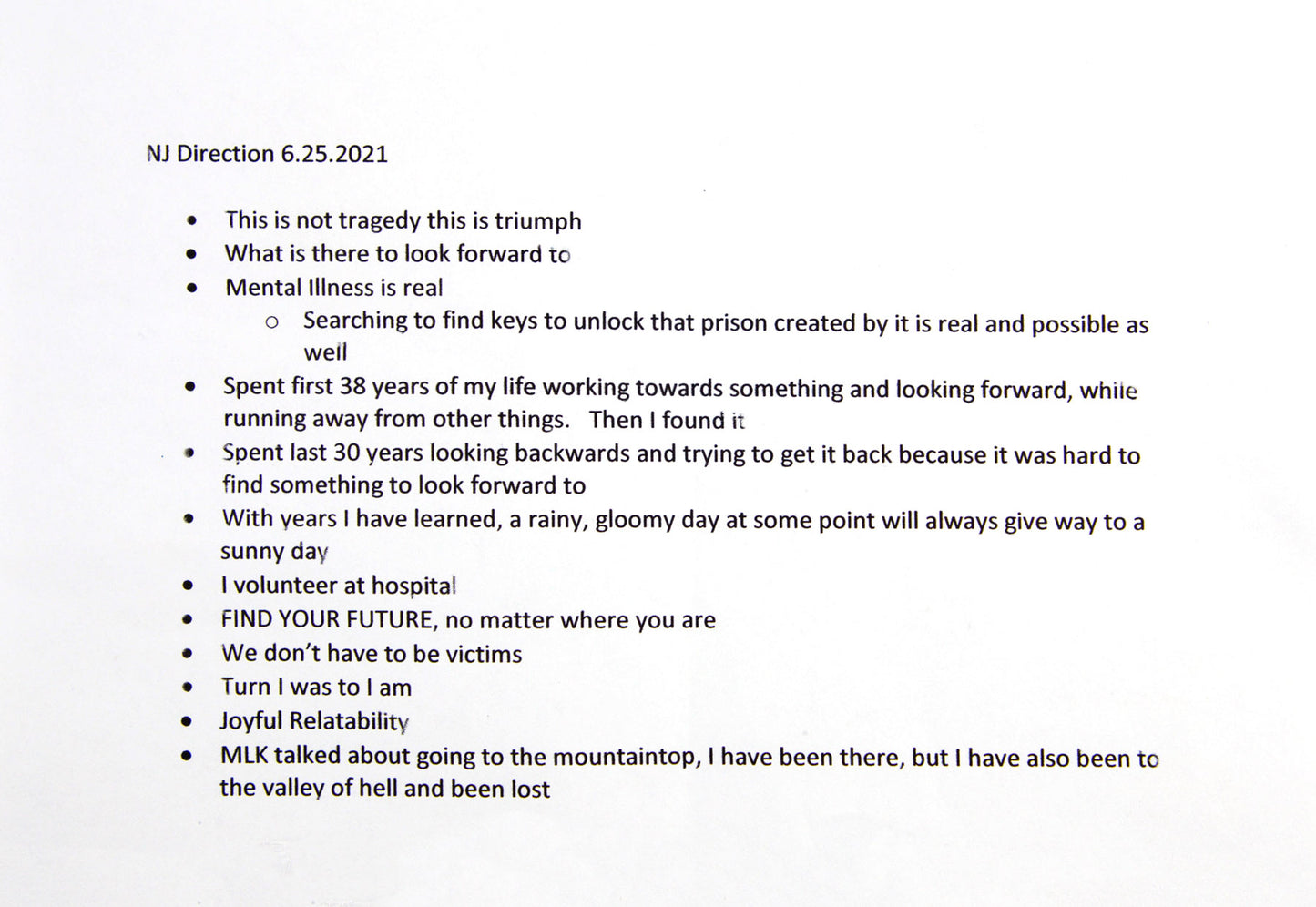 One page of Naomi's typed notes titled, "NJ Direction 6.25.2021." The document discusses her mental health journey and seems to have been written for a public speech.