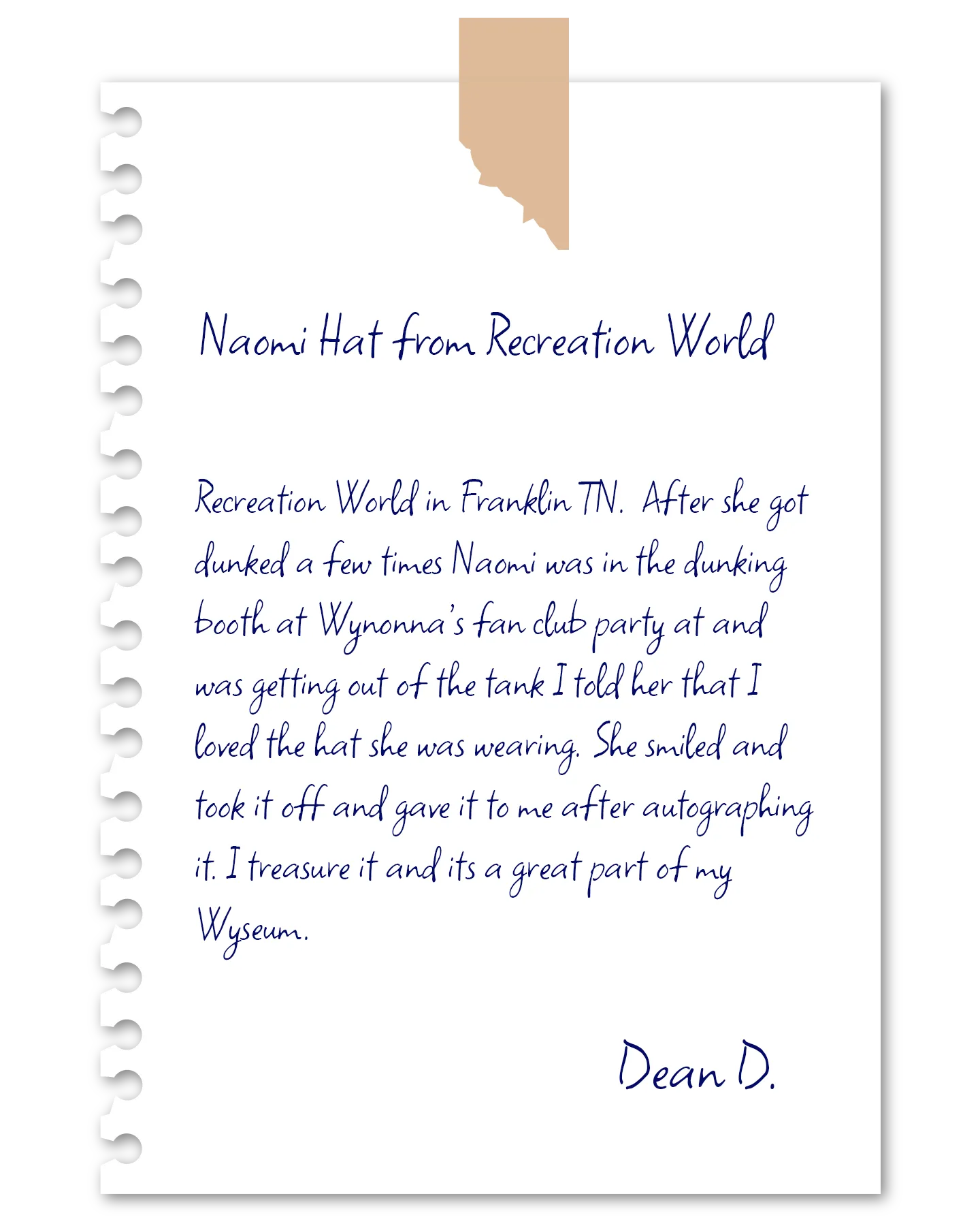 "Naomi Hat from Recreation World in Franklin TN: After she got dunked a few times, Naomi was in the dunking booth at Wynonna's fan club party. When she was getting out of the tank, I told her that I loved the hat she was wearing. She smiled and took it off and gave it to me after autographing it. I treasure it and its a great part of my Wyseum.