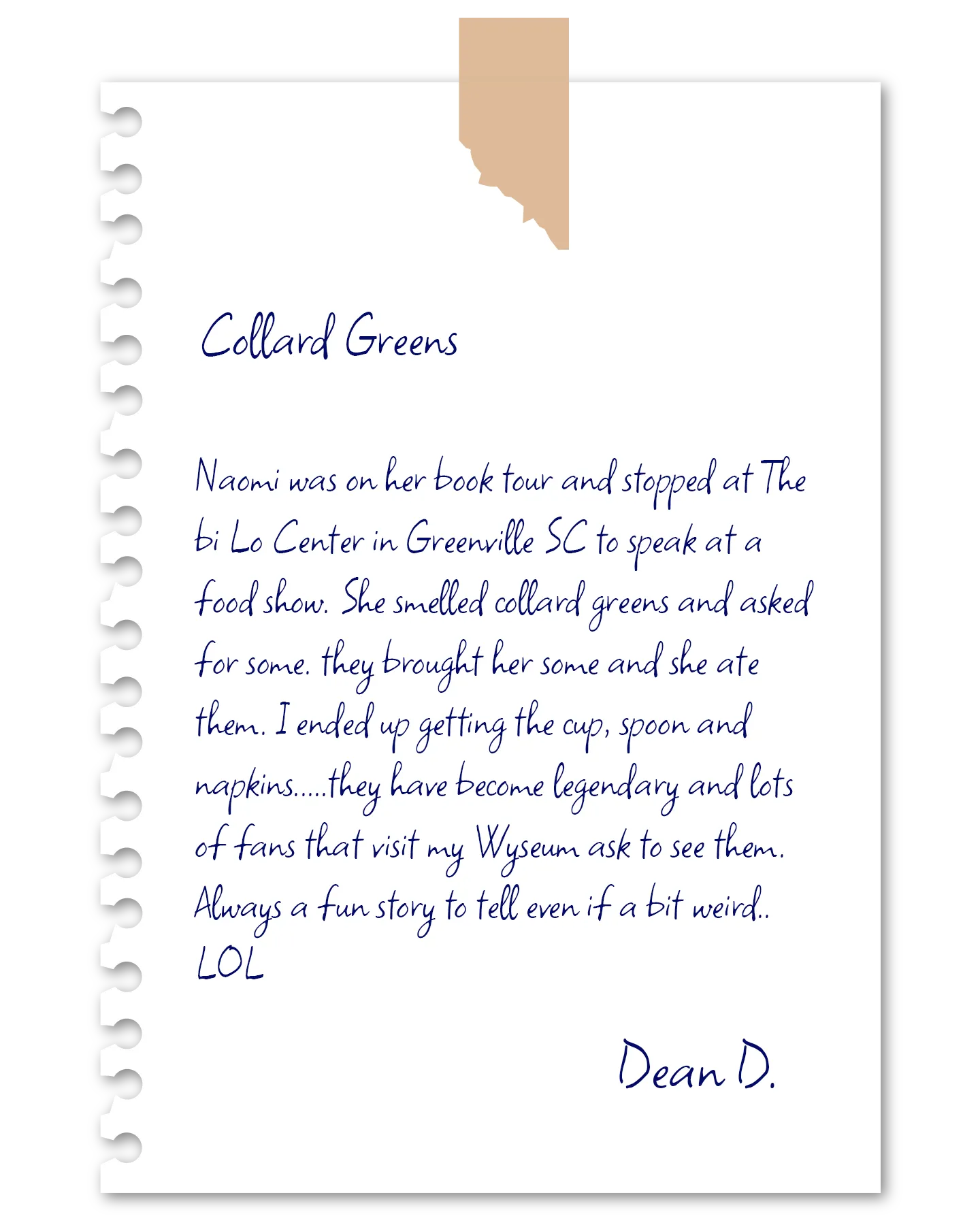 Collard Greens: Naomi was on her book tour and stopped at The BI-LO Center in Greenville, SC, to speak at a food show. She smelled collard greens and asked for some. I ended up getting the cup, spoon and napkins. They have become