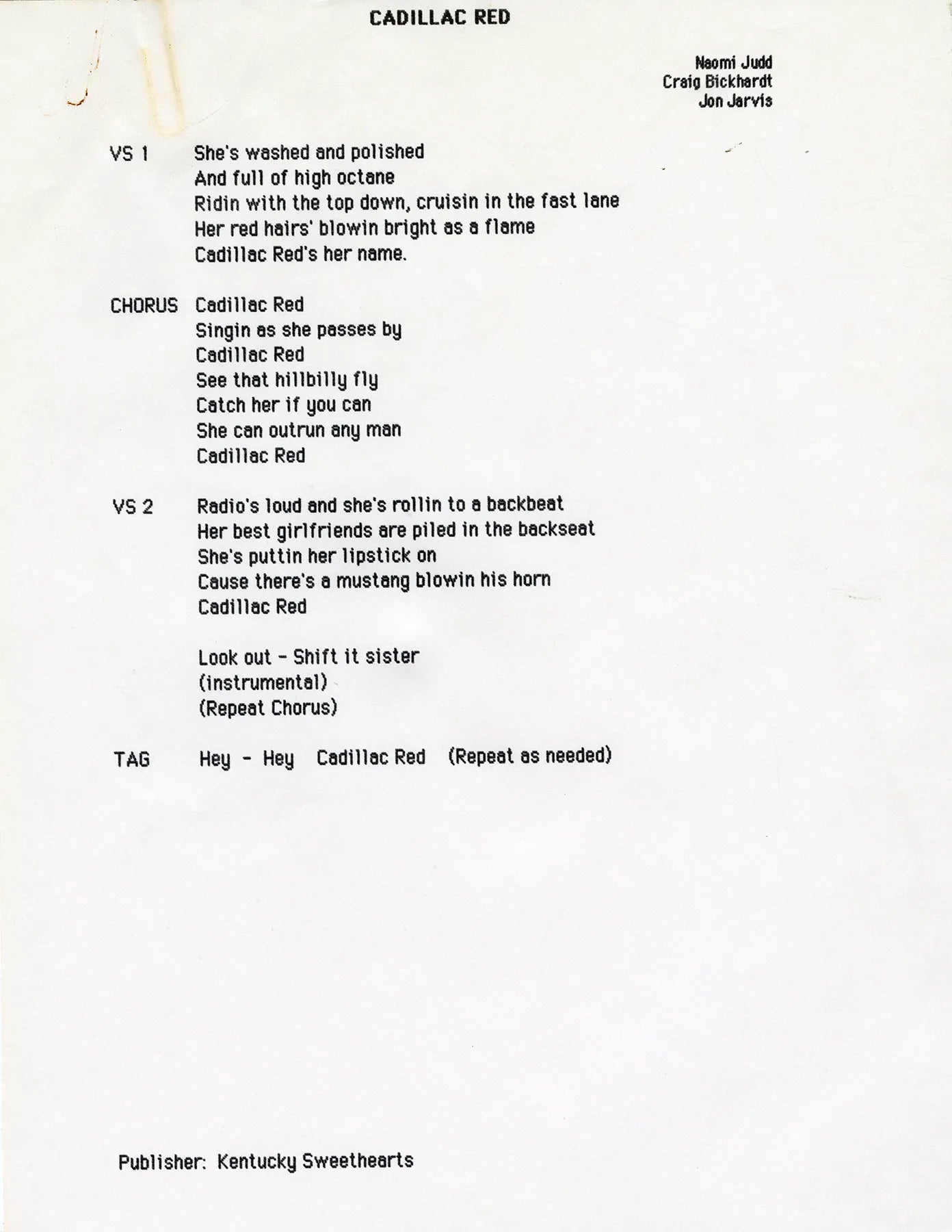 Typed lyrics for “Cadillac Red,” written by Naomi Judd, Craig Bickhardt, and Jon Jarvis. The song appeared on The Judds’ 1989 album River of Time and quickly stood out for its playful energy. With its tale of a fiery woman with red hair flying down the highway with her friends in tow, the song celebrated freedom, independence, and a little mischief.