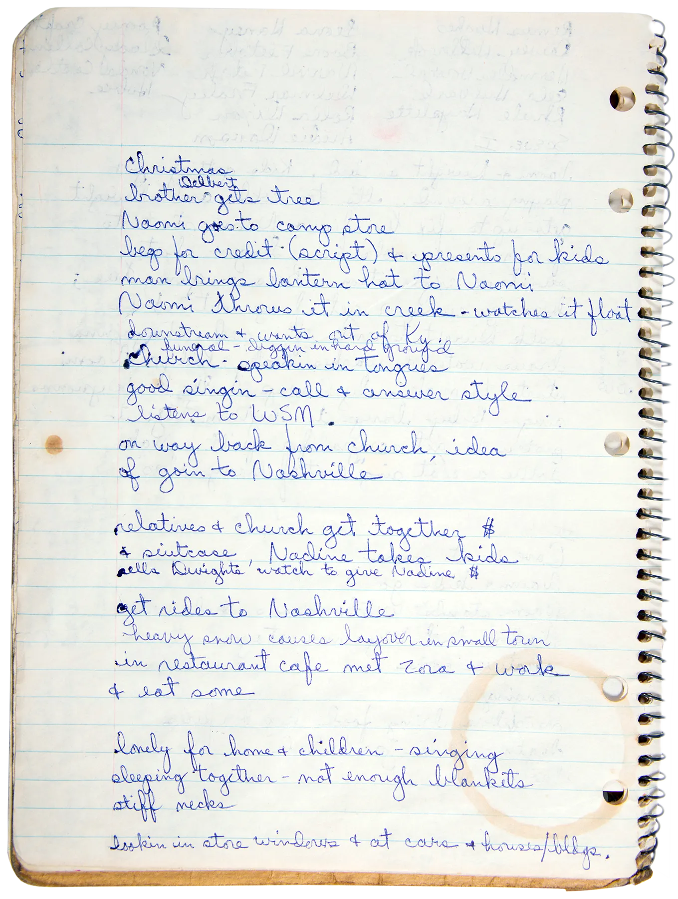 This handwritten notebook page shows Naomi in the midst of a creative brainstorm. Rather than a polished draft, it captures her gathering a stream of potent images, memories, and symbols: a Christmas tree, campfires, church sing-alongs, long nights without enough blankets, store windows glimpsed with longing. Some fragments read like autobiography, others like scenes waiting to become lyrics or stage imagery. Together, they show Naomi’s instinct for drawing from lived experience and transforming it into art, whether through music, storytelling, or visual ideas.